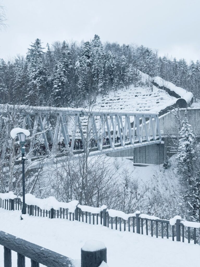 Hokkaido winter days are short. After 4:00 PM, the falls are illuminated — a completely different atmosphere from the daytime blue. We visited during snowfall, and the combination of falling snow and rushing water was genuinely breathtaking.