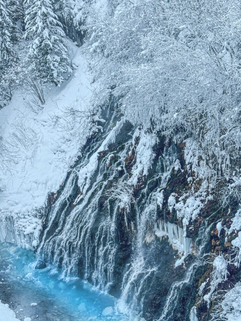 Biei’s Blue Pond is famous — but in winter, it freezes solid and the iconic blue disappears entirely. Shirahige Falls, fed by hot spring water, never freezes. In sub-zero temperatures, it keeps flowing, keeps steaming, keeps stunning.