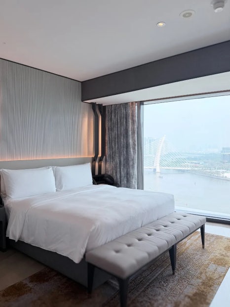 We stayed in the Deluxe Corner River View Suite King Bed — and opening that door to a 180-degree panoramic view of the Saigon River was a moment I won’t forget.