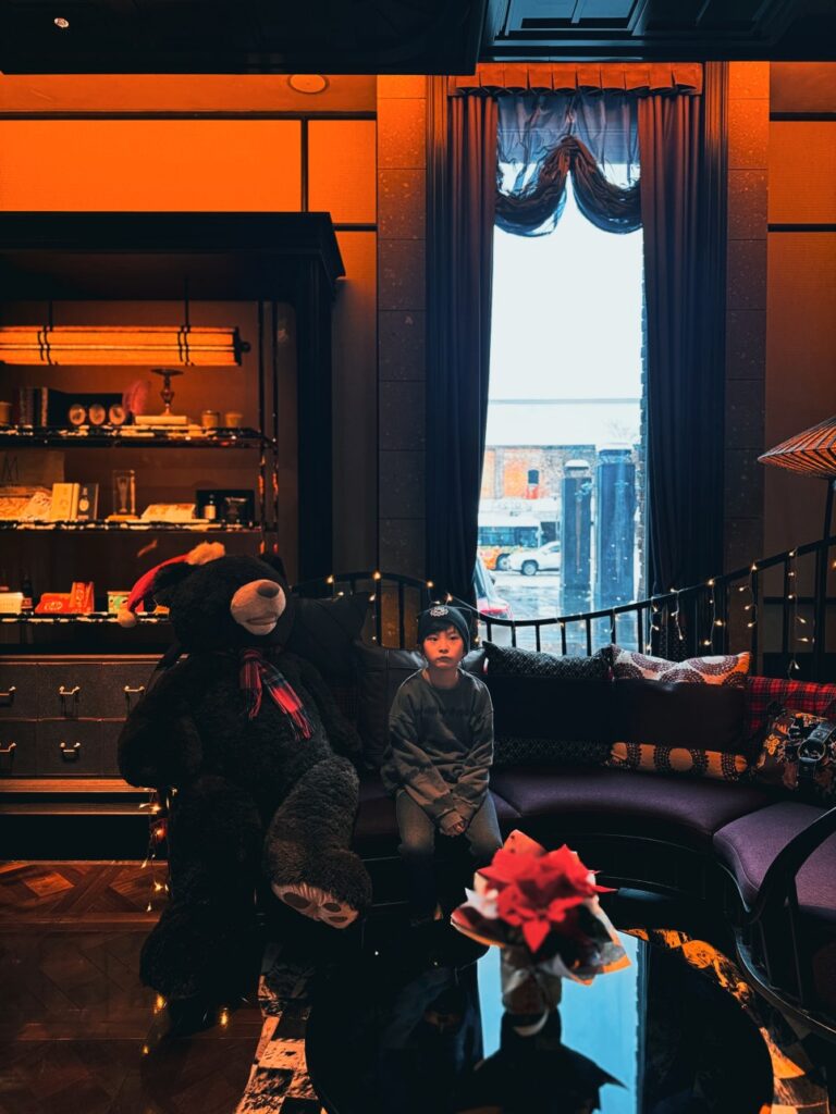 Hokkaido dairy-based cakes and cookies, premium teas and coffees. Nothing overly formal — just refined, calming, and exactly right after a morning of travel. My child gravitated immediately toward the chocolates and fruit. I took a quiet tea by the window and watched snow-covered Sapporo outside.