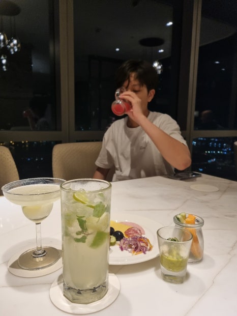 Wine, whiskey, beer — the lineup is extensive. For children, thoughtfully prepared non-alcoholic mocktails are also available. Watching the city lights of Ho Chi Minh flicker on one by one through the floor-to-ceiling windows, cocktail in hand — it was nothing short of art.