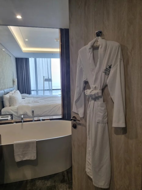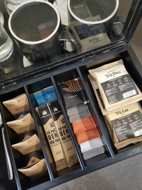 The bathroom is another highlight of this room. Finished in premium marble, a large soaking tub sits center stage — and yes, you can enjoy the city view from the tub too. I dissolved the provided bath salts into the water and soaked while watching Ho Chi Minh’s dazzling night skyline unfold below. The amenities were eco-conscious yet high quality — nothing felt like an afterthought.